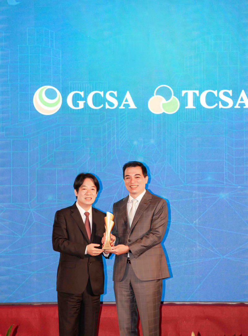 达全方位永续表现获全球永续奖及台湾永续奖肯定,由副总统赖清德颁奖 (左),必一·运动(B-Sports)总经理柯富仁 (右) 代表领奖